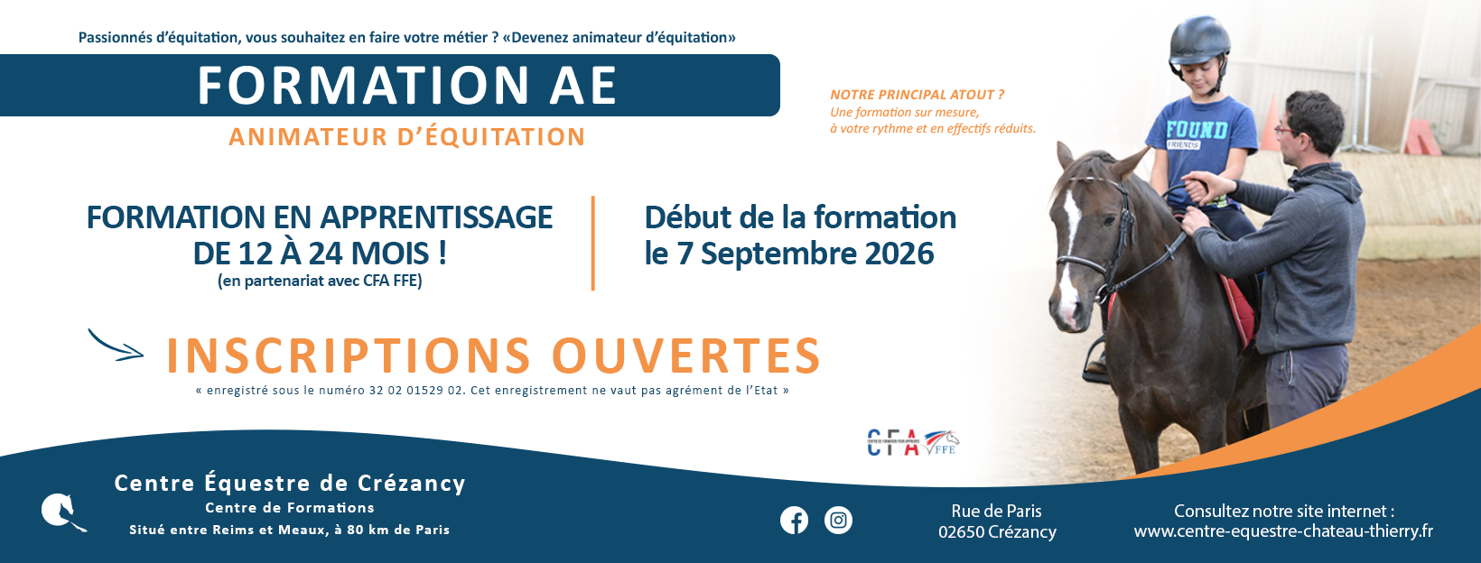 Nos locaux respectent la réglementation ERP et sont accessibles aux personnes à mobilité réduite.Référant handicap : bertinjerome@neuf.fr>>>> Délais du dépôt des dossiers : 6 mois avant le début de la formationPour les personnes en situation de handicap compatible avec la poursuite de la formation, l'avis d'un médecin agréé par la Fédération française handisport ou par la Fédération française de sport adapté ou désigné par la commission des droits et de l'autonomie des personnes handicapées, statuera sur la nécessité d'aménager le cas échéant la formation ou les épreuves certificatives selon la certification visée.La FFE statue sur cette demande : elle refuse ou accorde le ou les aménagements demandés au regard de la sécurité du candidat, des pratiquants, des tiers et des équidés. Dans le cas où des aménagements seraient acceptés, ils seront portés sur le livret de formation et communiqués au jury lors de l’examen.La FFE peut refuser la délivrance du livret de formation si la sécurité du candidat et des tiers ne peut être garantie dans le cadre de la formation. En dehors de cette procédure, le jury ne doit accorder aucun aménagement des situations certificatives.